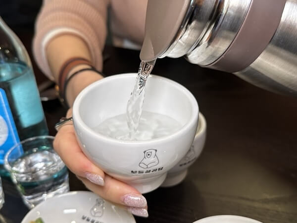 먹을 준비를 위해 물도 따라줍니다. 양재 맛집 보들설곰탕 마스코트가 그려져있는데 너무 귀엽워서 가지고 가고 싶었습니다.